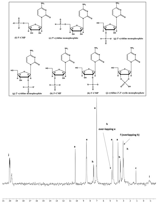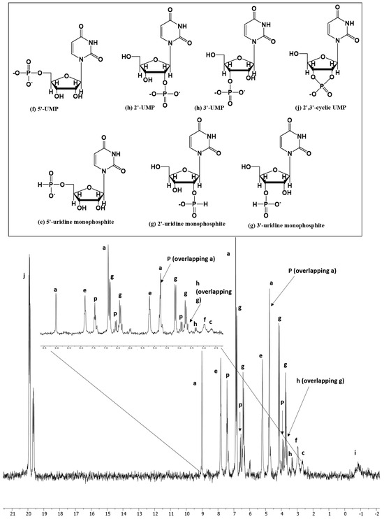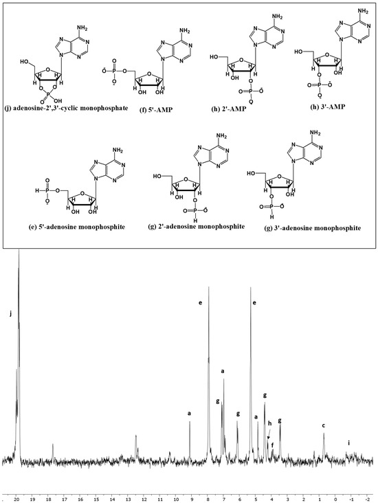 It is important to mention here that the peaks could easily be shifted right or left due to pH changes [52]. This is why each peak was identified by carefully looking at the splitting pattern in the H-coupled 31P-NMR spectrum, chemical shift values, and coupling constant (J). The samples were also spiked with standards whenever possible. Furthermore, finding the molecular weights of the targeted compounds via MS confirms some of these IDs. In case of adenosine, the compounds adenosine-5′-monophosphate and adenosine-2′,3′-cyclic monophosphate were confirmed by spiking with standards.