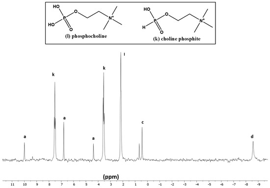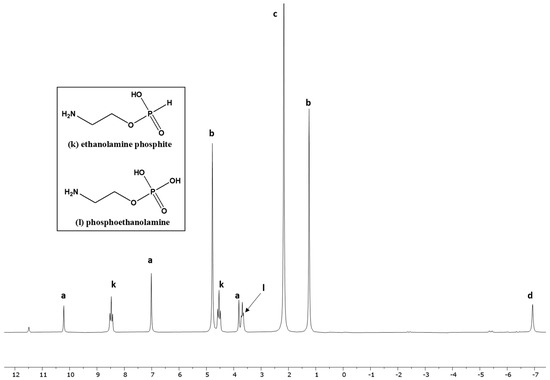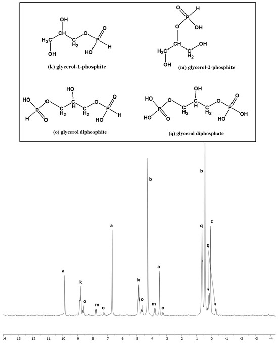 Organophosphorus compounds such as 5′-AMP, 5′-UMP, 5′-CMP, glycerol phosphates, and phosphoethanolamine were confirmed by spiking with standards [48,49]. The other organophosphorus compounds, including organic phosphites, were identified and characterized by studying their characteristic peak splitting in the H-coupled 31P-NMR, measuring their J-coupling constants, and by finding the target peaks in the mass spectrometer as reported previously [39,48,49,50].