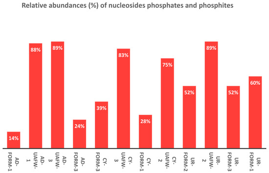 Various organophosphites were identified and characterized by analyzing their chemical shift values and C-O-P (carbon, oxygen, and phosphorus), as well as P-H (phosphorus and hydrogen), interactions of various organophosphorus species [39,48]. In the case of adenosine nucleoside, the best reaction sample was when the adenosine and IPF solution mixture was heated at 65–68 °C for 3 days and the solvent was UAFW. It produced about 89% of the phosphorylated and phosphonylated derivatives of adenosine. The compound adenosine-2′,3′-cyclic monophosphate (Figure 2, peak j) appeared as a multiplet around 20 ppm. The other cyclic derivative, i.e., adenosine-3′,5′-cyclic monophosphate derivative, was not present in the sample, which is usually located close to -2 ppm and appears as a doublet [48]. It should be noted that there seemed to be two sets of peaks around 20 ppm; apart from compound j (adenosine-2′,3′-cyclic monophosphate), there was possibly a double phosphorylation compound (2′,3′-cyclic, 5′-monophosphate or phosphite NMP). This observation was also consistent with other nucleosides, including uridine and cytidine, as well as our previous observations [48].