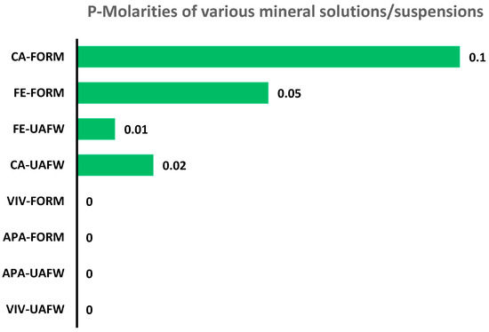 Phosphorus release from various minerals including vivianite, iron phosphite, apatite and calcium phosphite in formamide and UAFW solvents at 65–68 °C (3 days). The molarity of P in each solution was calculated by using Equation 1. Each value represents molarity [M]. In the present study, calcium phosphite in formamide seemed to have released most amount of P into the solution. Abbreviations are as follows: VIV (vivianite), CA (calcium phosphite), FE (iron phosphite), APA (apatite), Form (formamide), and UAFW (urea, ammonium formate, and water).
