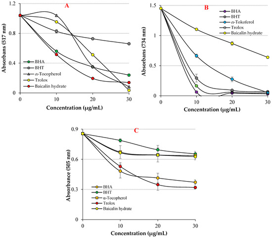 As shown in Table 1 and Figure 3A, baicalin hydrate showed excellent Fe3+ reducing ability, which was statistically proven to be highly significant (p < 0.01). The reducing ability of baicalin hydrate and standard antioxidants increased with increasing concentrations. For comparative purposes, the reference antioxidants BHA, BHT, α-tocopherol, and Trolox were employed. Stock solutions of all standards were prepared in ethyl alcohol. These standards were used because the antioxidant molecules BHA and BHT are strong, synthetic, and standard antioxidants; meanwhile, α-tocopherol and trolox, water-soluble analogues of tocopherol, were used as natural and standard antioxidants [51,52]. The Fe3+ reducing capacity of baicalin hydrate and the references were recorded in the following order: BHA (λ700: 2.347 ± 0.046, r2: 0.9086) >Trolox (λ700: 2.119 ± 0.001, r2: 0.9586) > baicalin hydrate (λ700: 1.249 ± 0.014, r2: 0.9848) > α-Tocopherol (λ700: 0.957 ± 0.018, r2: 0.9863) ≥ BHT (λ700: 0.952 ± 0.023, r2: 0.9154) at 30 μg/mL. The findings demonstrated that baicalin hydrate’s Fe3+ reducing capacity is lower than that of BHA and Trolox but comparable to that of BHT and α-Tocopherol. When examining the literature on this topic, it is observed that the Fe3+ reducing absorbance for usnic acid has been determined as 0.278 (r2: 0.9567) [53], 2.769 for caffeic acid (r2: 0.9945) [54], 0.432 (r2: 0.9981) for uric acid [55], 0.739 (r2: 0.9478) for coumestrol [16], 2.428 (r2: 0.9474) for tannic acid [56], 1.012 (r2: 0.9523) for spiraeoside [57], 0.967 (r2: 0.9938) for magnofluorine [28] and 2.509 (r2: 0.9906) for caffeic acid phenethyl ester [58] at similar concentration.
