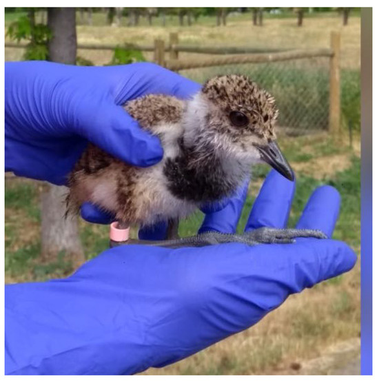During July 2018, breeding territories were recognized and monitored weekly to identify egg lying. Subsequently, the monitoring frequency increased to determine hatching dates. We marked the four-day-old chicks individually with colored plastic bands (Figure 2). Ten to thirteen days later, the observer approached calmly and respectfully, and chicks were removed individually, carried away from the nest (40–50 m), and a small blood sample (approximately 50 μL) was obtained by puncturing the metatarsal vein with a sterile needle and extracting blood into heparinized micro-hematocrit capillary tubes. We weighted chicks using a digital scale. We took a drop of blood (from the micro-hematocrit capillary tubes) for smears on individual slides. These were air-dried and fixed with methanol (Reagents, Inc., Charlotte, NC, USA) for 10 min. Then, each chick was housed in a carton box (30 × 30 × 50 cm), removed after 30 min, and we obtained another blood sample (from the other metatarsal vein) to quantify the stress response. We stored samples on ice until the end of the sampling period (maximum of 5 h), and then centrifuged them for 5 min at 8000 rpm to separate the plasma from the red blood cells. The plasma was aspirated with a Hamilton syringe and stored (at −20 °C) until being assayed for total Cort content. In total, 58 (29 for baseline Cort and 29 for stress response analysis) blood samples were collected: 26 from the urban low-polluted site (13 individuals from 10 nest), 20 from the urban high-polluted site (10 individuals from 8 nest), and 12 from the rural site (6 individuals from 6 nest).