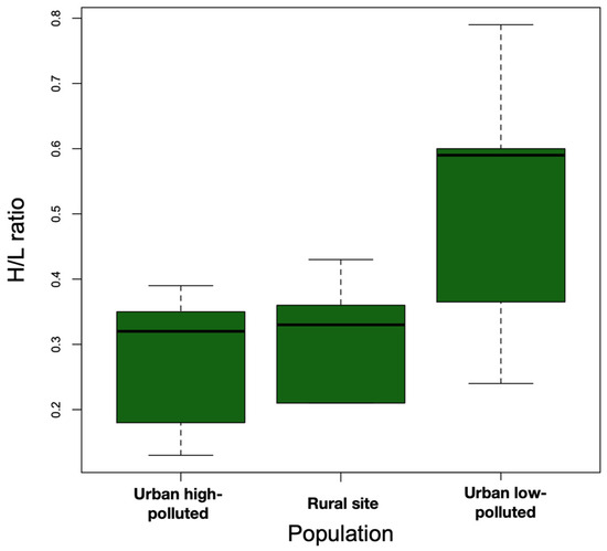 Boxplot showing that the median H/L ratio (bold horizontal line) was higher in the urban low-polluted area (n = 13) than urban high-polluted area (n = 10) and the rural site (n = 6) during the 2018 austral spring in the Metropolitan Region of Santiago de Chile. The top and bottom sides of each box represent 75th and 25th percentiles, respectively. Whiskers indicate maximum and minimum H/L ratio values.