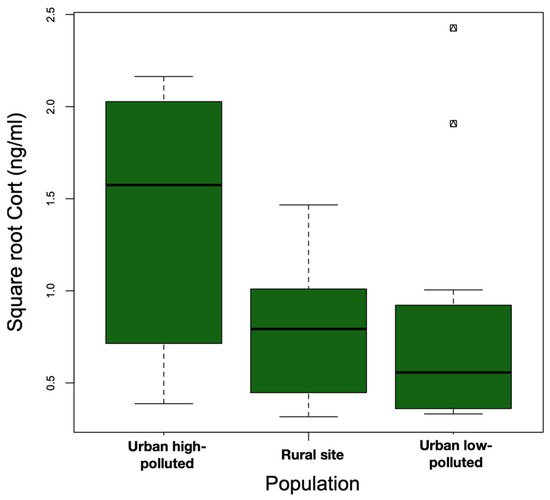Median square root baseline Cort (ng/mL) (bold horizontal line) was higher at the urban high-polluted site (n = 10) than at the urban low-polluted site (n = 13) and at the rural site (n = 6) during the 2018 austral spring in the Metropolitan Region of Santiago de Chile. The top and bottom sides of each box represent the 75th and 25th percentiles, respectively. Whiskers indicate the maximum and minimum baseline Cort values.