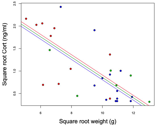 Negative association between the square root weight (g) and square root baseline Cort (ng/mL) of southern lapwing chicks during the 2018 austral spring in the Metropolitan Region of Santiago de Chile. Red: urban high-polluted site (n = 10). Blue: urban low-polluted site (n = 13). Green: rural site (n = 6).