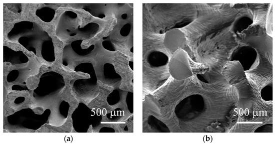 SEM micrographs for a cross-section of the (a) trabecular bone (88% of porosity) and (b) SLA 3D printed construct (70% of porosity).
