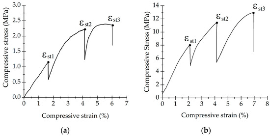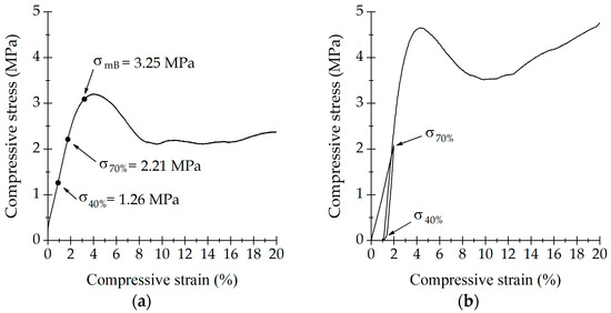 Figure 2 shows the results for monotonic compression and for the three-step procedure of trabecular bone. In Figure 2a, the monotonic compression of trabecular bone and the results for σmB, σ70% and σ40%. In Figure 2b, the three-step procedure of trabecular bone is shown. These results show an initial linear elastic behavior, up to 3% strain. Then it reached plasticity, and σult was found at 4.5%. At 5% strain, there was a reduction in stress followed by a small slope after 10%. After ε = 12%, the cylindrical-porous structure collapsed, and densification started, this was evident as stress began to increase.
