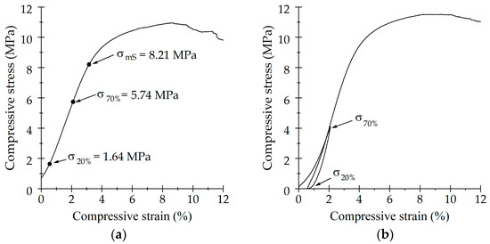 Then, the three-step procedure was set up using these parameters. An initial compression was set at a constant strain rate of 0.0028 mm/s until σ70% was reached, then unloading of the sample at 2.8 mm/s back to σ20% and then, loading of the sample at a strain rate of 0.028 mm/s until strain reached ε = 20%. The mechanical parameters, ultimate stress (σult), compressive yield stress (σy), and E, were calculated as previously explained for trabecular bone.