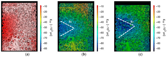 Figure 6a shows the strain accumulation during elastic deformation of the SLA sample. The highest strain magnitude reached was ~−34,000 µε. Figure 6b shows the strain accumulation during plastic deformation, the strain concentrated as an inclined plane noted by s3 and had a value of ~−64,000 µε. Region s4 shows the strain concentration after the sample had yielded. It reached −115,000 µε, see Figure 6c. The variations on the εzz scale between Figure 6a–c corresponds to incremental strain proportions. This prompted us to maintain consistent color maps while adjusting the value ranges.