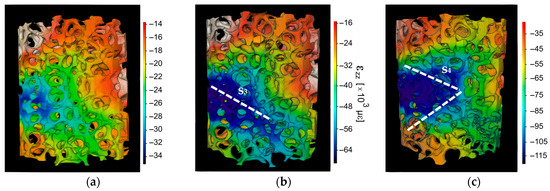 DVC was used to quantify εzz (µε) distribution in both cellular materials. Figure 5 and Figure 6 show the strain maps rendered over the reconstructed µCT volume. Figure 5a shows the strain accumulation on trabecular bone during elastic deformation where εzz remained largely within −10,000 µε with peaks to ~−20,000 µε. The strain distribution (εzz) during plastic deformation reached a maximum strain magnitude of ~−85,000 µε, noted by s1 (Figure 5b). This was located in the outer-middle section of the bone sample. As loading increased, the strain region grew larger, see Figure 5c. However, it remained in the middle of the bone sample s2.
