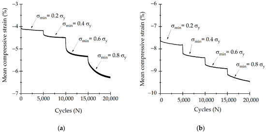 Samples were studied with the multi-step test to examine strain accumulation during 5000 cycles and strain variation with load increase. Mean stress was calculated as σ = │σmax + σmin│. Figure 7a shows σmean as a function of cycle number (N) for bone. Strain increased with each compressive step every 5000 cycles. Mean strain varied slightly for the first three compressive steps where σmin was 0.2σy, 0.4σy, 0.6σy. However, for 0.8σy, mean strain increased from 5.5% to 6% during the 5000 cycles. The multi-step test for SLA samples is depicted in Figure 7b. Compressive mean strain remained similar between each compressive step. For both samples, mean strain increased for every step according to the applied load.