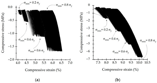 Hysteresis loops of the multi-step test are shown in Figure 8. The resulting hysteresis loops indicated no significant damage occurred on the samples for 5000 cycles. This was evident because the loops exhibited a slow shift in the strain axis. Successive hysteresis loops did not show broad changes in their slopes. Dynamic loading induces accumulative deformation on samples. However, there was no material damage when the load was increased.