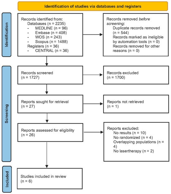 Figure 2 illustrates the flow diagram of the process of identifying and selecting studies. The search strategy across databases and registers retrieved a total of 2271 studies: 96 from PubMed/MEDLINE, 408 from Embase, 243 from Web of Science, 1488 from Scopus, and, finally, 36 clinical trials from CENTRAL. After duplicates were removed, a total of 1727 was remaining for screening by title and abstract analysis. A total of 27 studies were assessed by full-text review, of which 21 did not meet the eligibility criteria and were consequently excluded. Only six studies met the inclusion criteria, and they were included in the final sample for data extraction and analysis [23,24,25,26,27,28].