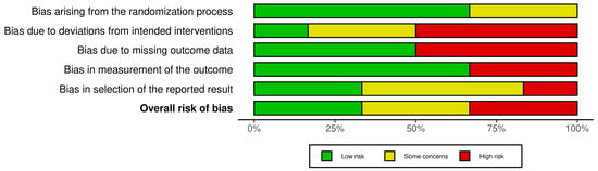 The methodological quality of the primary-level studies was rigorously evaluated using the Cochrane Collaboration’s RoB-2 tool for evaluating the risk of bias [22]. Various potential biases were examined and categorized into five specific domains, which encompassed: (1) The randomization process; (2) Deviations from intended interventions; (3) Missing outcome data; (4) Measurement of the outcome; and (5) Selection of the reported result. Each domain was assessed independently in each primary-level study, with specific details and potential biases noted. A sixth and final domain evaluated the overall risk of bias, taking into account the findings from the previous five domains. To visualize the risk of bias, risk of bias plots were generated using the Cochrane robvis web app.
