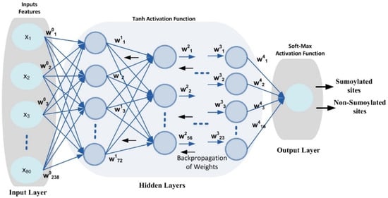 As shown in Figure 3, this work predicts sumoylation sites using a benchmark dataset and a DNN model with four hidden layers. The DNN design employs several neurons to assess the input feature vector and create output using Equation (8). The weight matrix for each neuron is established using the Xavier function [45], which may keep the variance constant through each layer. In addition, the weight matrix is updated using a back-propagation approach to eliminate errors between the output and target classes. The input layer and buried layers both use the Tanh nonlinear activation function. A dataset’s nonlinearity and complicated patterns can be learned by a model with the aid of the activation function. Additionally, it decides whether a neuron may be fired or ignored based on the output that a specific neuron produces [46]. A SoftMax activation function is also used at the output layer to provide a value between [0, 1] that reflects the probability that a certain class of data points would be included in the output.
