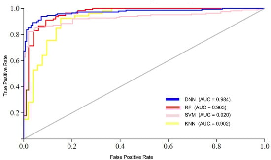 The analysis of the results suggests two foremost causes for the superior performance of the proposed model compared to conventional learning algorithms. First, traditional learning methods typically employ a single-stack processing layer, which may not effectively handle complex datasets with high nonlinearity. In contrast, to process complex datasets effectively, the DNN model utilizes multi-stack processing layers and automatically extracts optimal features. Furthermore, the performance of the DNN model was compared to conventional learning algorithms in terms of AUC (area under the ROC curve), as shown in Figure 5. The figure illustrates that the proposed DNN model achieved the highest AUC value compared to the conventional learning algorithms. For instance, the DNN model achieved an AUC value of 0.984, while the RF, SVM, and KNN algorithms achieved AUC values of 0.963, 0.920, and 0.902, respectively.