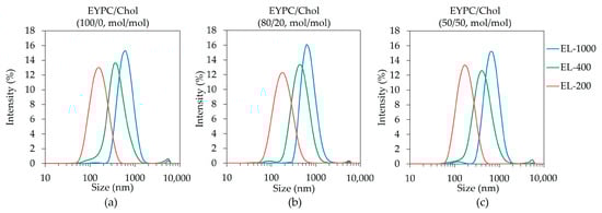 Size distribution of EYPC/Chol (100/0 (a), 80/20 (b), 50/50 (c), mol/mol) liposomes modified with polysaccharide derivative. Liposome size control was performed by extrusion with 1000, 400, or 200 nm polycarbonate membranes and subsequent centrifugation.