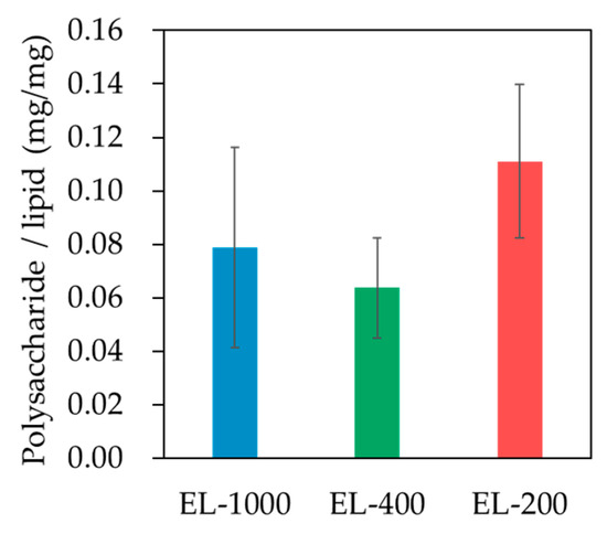 Size control of liposomes modified with MGlu-Aquaβ was performed by extrusion with polycarbonate membranes having various pore sizes (Scheme 1) based on a report of a study by Matsuoka et al. [36]. In this report, a liposome of diameter > 600 nm induced cell-based immune responses, whereas a liposome of diameter < 400 nm activated immune cells [36]. In addition, the size limit for clathrin-mediated endocytosis is regarded as less than 200 nm. Considering these reports, the sizes of 1000, 400, and 200 nm were chosen to evaluate the size impact for the properties of the liposomes. A mixed thin film composed of polysaccharide derivatives and lipids (EYPC/Chol = 80/20, mol/mol) was dispersed in PBS to produce the liposome suspension. After freeze–thaw processing, the centrifugation–resuspension cycle of the liposome suspensions was repeated three times to remove the free polysaccharide derivative, which was not modified onto liposomes. For liposome size control, the liposomes were passed through polycarbonate membranes of 1000, 400, or 200 nm pore size. Just after extrusion with 1000 and 400 nm membranes, liposomes possessed a wide size distribution (Figure S2). Therefore, the liposome suspensions were centrifuged further to remove smaller liposomes. The purified liposomes extruded with a polycarbonate membrane of 1000, 400, or 200 nm pore size (EL-1000, EL-400, or EL-200) showed 655.8 ± 31.2, 402.8 ± 5.8, or 162.2 ± 6.6 nm, respectively corresponding to the pore sizes of membranes (Table 1, Figure 1 and Figure S3). Polydispersity indexes (PDIs) of liposomes were 0.226, 0.248, and 0.185 for EL-1000, EL-400, and EL-200, respectively. Liposome morphology observed by a transmission electron microscopy (TEM) implied that liposomes were of spherical shape, and their sizes corresponding to the pore size of membranes were controlled by extrusion (Figure S4). The amounts of polysaccharide derivatives in each liposome were ascertained using the phenol–sulfuric acid method. The weight ratios of polysaccharide per lipid in EL-1000, EL-400, and EL-200 were 0.079 ± 0.037, 0.064 ± 0.019, and 0.111 ± 0.029 mg/mg, respectively (Figure 2). The modification amounts of polysaccharide derivatives on liposomes were almost identical irrespective of the pore size of the polycarbonate membrane used for extrusion. Polysaccharide-derivative-modified liposomes with all sizes possessed negative zeta potentials because of carboxy groups with polysaccharide derivatives modified on the liposomes (Table 1). The zeta potential for unmodified liposomes was −7.9 mV [25], which is less value compared with polysaccharide-derivative-incorporated liposomes. These data suggest that the liposome surface is modified with polysaccharide derivatives.