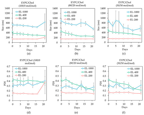 (a–c) Particle size and (d–f) PDI of EYPC/Chol (100/0, 80/20, 50/50, mol/mol) liposomes modified with polysaccharide derivative. Liposome size control was performed by extrusion with 1000, 400, or 200 nm polycarbonate membranes.
