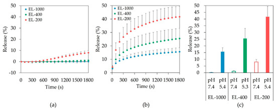 To evaluate liposome size effects on the pH-responsive property of polysaccharide-derivative-modified liposomes, the release profile from pyranine-encapsulating EYPC/Chol (80/20, mol/mol) liposomes was investigated. Liposomes encapsulating pyranine and DPX as a fluorescent dye and a quencher, respectively, were prepared using the same method as that described above. Fluorescence derived from pyranine is quenched by DPX in liposomes, but the fluorescence intensity was drastically increased when these molecules were released from liposomes because of the decreasing quenching effect. Pyranine fluorescence intensity after the addition of Triton X-100 to a given amount of liposome suspension was almost identical, indicating that the pyranine molecule content per liposome is almost the same in evaluated liposomes (Figure S5). Yuba et al. reported that the pKa of 3-methylglutarylated polysaccharides (e.g., MGlu-curdlan) was in the range of 5.7–6.0, and MGlu-curdlan formed hydrophobic domains in weakly acidic pH, which induces the destabilization of the liposome membranes via hydrophobic interaction, leading to content release from 3-methylglutarylated polysaccharide-modified EYPC liposomes [26]. Pyranine was released only slightly from pyranine-loaded EL-1000, EL-400, and EL-200 at pH 7.4 (Figure 4a). Pyranine release occurred with all size-controlled liposomes at pH 5.4, which corresponds to the pH within endosomes. Moreover, small liposomes tended to show higher release capability than large liposomes (Figure 4b,c). In addition, the initial release rate of small liposomes was higher than that of large liposomes (Figure S6). This high rate resulted from the high curvature of the lipid membrane in small liposomes. Small liposomes have higher curvature of lipid membranes than large liposomes; that higher curvature is unstable because of the looser packing of the membrane [8,11]. Hatzakis et al. reported that small liposomes increased the density of packing defects compared with large liposomes [45]. Bending a bilayer created mismatches to the packing of phospholipids, and hydrophobic moieties were exposed to an aqueous medium. EL-200 leaked pyranine slightly under neutral conditions compared with EL-1000 and EL-400, which might be caused by increased packing defects in small liposomes and decreased liposome stability. In addition, hydrophobic domains formed by polysaccharide derivatives at weakly acidic pH might be prone to access hydrophobic moieties of phospholipids because small liposomes possess more packing defects and expose hydrophobic moieties of phospholipids. Therefore, the liposomal membrane of small liposomes might be destabilized by polysaccharide derivatives more easily than those of large liposomes. The effects of the Chol content on the release from liposomes were evaluated using EYPC/Chol (80/20, 50/50, mol/mol) liposomes extruded with a 400 nm membrane. Results show that EYPC/Chol (50/50, mol/mol) liposomes had a lower release because of their rigid membrane compared with the release of EYPC/Chol (80/20, mol/mol) liposomes (Figure S7). These results suggest that EYPC/Chol (80/20, mol/mol) liposomes were more suitable lipid components for pH-responsive liposomes than liposomes with the other Chol ratios to balance their stability and pH-responsive drug release capabilities.
