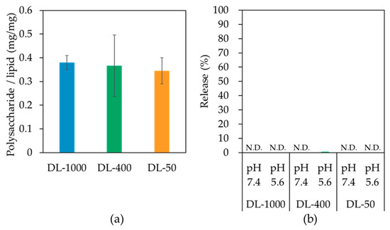 Similarly to EYPC/Chol liposomes, the amounts of polysaccharide derivatives in each DPPC/Chol liposome were ascertained using the phenol–sulfuric acid method. The weights of polysaccharide derivatives per lipid in DL-1000, DL-400, and DL-50 were 0.380 ± 0.029, 0.366 ± 0.130, and 0.345 ± 0.055 mg/mg, respectively (Figure 5a). These amounts were three-fold to six-fold the amounts of EYPC/Chol liposomes. Hąc-Wydro et al. reported the packing degree for the mixture of stearic acid (saturated fatty acid) and 1,2-dioleoyl-sn-glycero-3-phosphocholine (unsaturated phospholipid) as lower than that of stearic acid and DSPC (saturated phospholipid), which indicates strong interaction between the hydrophobic chains of saturated fatty acid and saturated phospholipid [23]. Therefore, saturated decyl chains conjugated with polysaccharide derivatives might interact more strongly with DPPC, saturated phospholipid, than EYPC, unsaturated phospholipid, within each liposome membrane. Next, the pH-responsive release behavior of DPPC/Chol liposomes modified with polysaccharide derivatives was evaluated using liposomes encapsulating pyranine and DPX. Irrespective of the liposome size, none of the liposomes released the pyranine both under neutral (pH 7.4) and weakly acidic pH (pH 5.6) conditions (Figure 5b). Takechi-Haraya et al. reported that DPPC/Chol (50/50, mol/mol) liposomes showed a higher bending modulus than EYPC/Chol (50/50, mol/mol) liposomes, indicating that DPPC/Chol liposomes possess high rigid lipid membranes [21]. Gürsoy et al. reported that DPPC/Chol (2:1, mol/mol) liposomes leaked less amounts of content than EYPC/Chol (2:1, mol/mol) liposomes [47]. Also, Jo et al. reported that the degree of release from EYPC liposomes modified with pH-responsive polymer, poly(N-isopropylacrylamide-co-methacrylic acid-co-octadecylacrylate) conjugated to glucose oxidase, was higher than that from DPPC liposomes modified with the polymer under the weakly acidic conditions [48]. These reports were attributable to the more rigid DPPC liposome membranes than EYPC liposome membranes. The driving force for liposome membrane destabilization of polysaccharide derivatives was hydrophobic domains formed by MGlu groups in weakly acidic pH [26]. In addition, polysaccharide derivatives, which showed high hydrophobicity in the high pH region, induced increased content release in the high pH region [26]. The hydrophobic domains formed by MGlu groups in polysaccharide derivatives might not form enough hydrophobic domains to destabilize rigid DPPC/Chol (50/50, mol/mol) membranes. Consequently, the high rigidity of DPPC/Chol (50/50, mol/mol) liposomes might prevent protonated polysaccharide derivatives from destabilizing liposome membranes, resulting in a lack of pyranine release from liposomes. Therefore, our results suggest that EYPC/Chol liposomes are a more suitable lipid component for pH-responsive liposomes than DPPC/Chol liposomes.