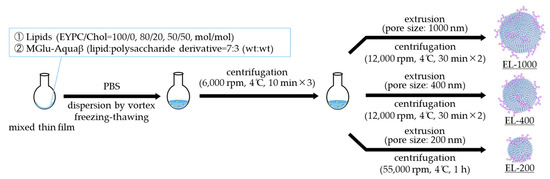 For EYPC/Chol liposomes, a given amount (5–10 mg) of EYPC and Chol (EYPC/Chol = 100/0, 80/20, 50/50, mol/mol) dissolved in chloroform was added to a round-bottom flask. After evaporation of chloroform using a rotary evaporator, MGlu-Aquaβ (lipid:polysaccharide derivative = 7:3, wt:wt) dissolved in methanol was added to the flask. The solvent was evaporated. The remaining organic solvent was removed further under vacuum. The obtained mixed thin film of lipids and MGlu-Aquaβ was dispersed in phosphate-buffered saline (PBS) by a brief vortex. The liposome suspension was hydrated further by freeze–thaw cycles. The liposome suspension was centrifuged (6000 rpm, 10 min, 4 °C), and the pellet was resuspended in PBS. This procedure was performed three times to remove unmodified MGlu-Aquaβ molecules from the liposomes. The removal of free MGlu-Aquaβ was confirmed by measuring the amount of MGlu-Aquaβ in the third supernatants using a phenol–sulfuric acid method [31,32,33,34]. To control the liposome size, for EYPC/Chol liposomes, EYPC/Chol liposome suspension was extruded through polycarbonate membranes of 1000, 400, or 200 nm pore size at room temperature (EL-1000, EL-400, and EL-200). EL-1000 and EL-400 were further centrifuged (12,000 rpm, 30 min, 4 °C) twice to remove smaller liposomes. EL-200 was concentrated by centrifugation (55,000 rpm, 1 h, 4 °C).