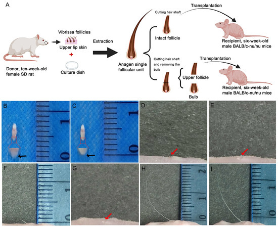 Experimental schematic of the SD rat vibrissa follicle xenograft model, macroscopic view and follow-up of the xenograft follicles in mice. (A) Experimental schematic of the SD rat vibrissa follicle xenograft model in BALB/c-nu/nu mice. (B–I) Macroscopic view and follow-up of the xenograft follicles in mice. Extracted intact follicle (IF) with a bulb (black arrow in B). Extracted upper follicle (UF) without a bulb (black arrow in C). Day 1 transplantation site wounds and skin elevations (red arrows in D,E) created by the transplanted follicles under the dorsal skin (IF group: D; UF group: E). The IF group on Day 5 (F). No hair growth (red arrow in G) was seen in the UF group on Day 5 after transplantation (G). Representative IF (H) and UF (I) hairs on Day 37.