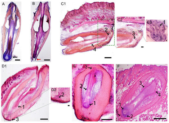 To study the morphological changes of transplanted follicles, microscopic examination was conducted by HE staining on Day 1, Day 5 and Day 37. HE staining showed an extracted IF on the anagen phase with a bulb (Figure 2A) and the UF without a bulb (Figure 2B). On Day 5 after transplantation, the IF under the skin entered catagen V–VI (mid-late dystrophic catagen) (Figure 2(C1–C3)). Figure 2(D1,D2) shows that on Day 5, the bottom ORS (outer root sheath) of the UF was filled with DS cells from the DS, but the bulb had not yet formed. On Day 37 after transplantation, both groups had progressed to anagen (IF group: Figure 2E; UF group: Figure 2F), with a regenerated bulb at the bottom in the UF group (Figure 2F).