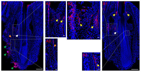 Expression of tyrosine hydroxylase (TH) around normal vibrissa follicles in situ using anti-TH (red) antibody. (A,B) TH-positive nerve fibers (yellow arrows in A2 and B1–B3) originated from bundles (green arrows in A1) around the capsule (a fibrous sheath of connective tissue) (orange arrows in A1,A3) of vibrissa follicles, penetrated the capsule and innervated the bulge regions of hair follicle (HF) (white arrows in A1,B1) in situ. Scale bars, 160 μm (A2,A3,B2,B3); 300 μm (elsewhere).