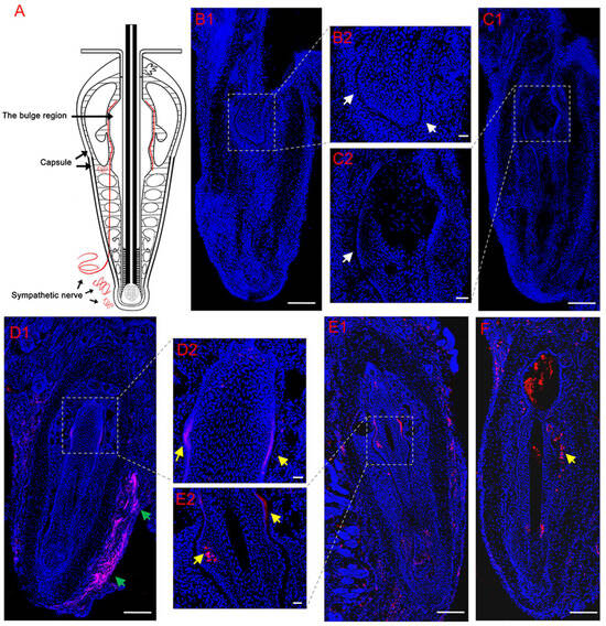 Temporal variation in changes in expression of TH around vibrissa xenografted follicles using anti-TH (red) antibody. (A) Schematic representation of sympathetic innervation of the vibrissa follicle in situ based on immunofluorescence observations. (B,C) Almost no TH-positive nerve fibers innervated the bulge regions of the HF (white arrows in B2,C2) in the IF (B) and UF (C) groups 5 days after transplantation. (D–F) By Day 37, small TH-positive nerve fibers (yellow arrows in D2,E2,F) reinnervated the bulge regions of the IF (D,F) and UF (E) groups, and the capsules of the IF group were hyperinnervated by TH-positive nerves (green arrow in D1). Scale bars, 160 μm (B2,C2,D2,E2); 300 μm (elsewhere).