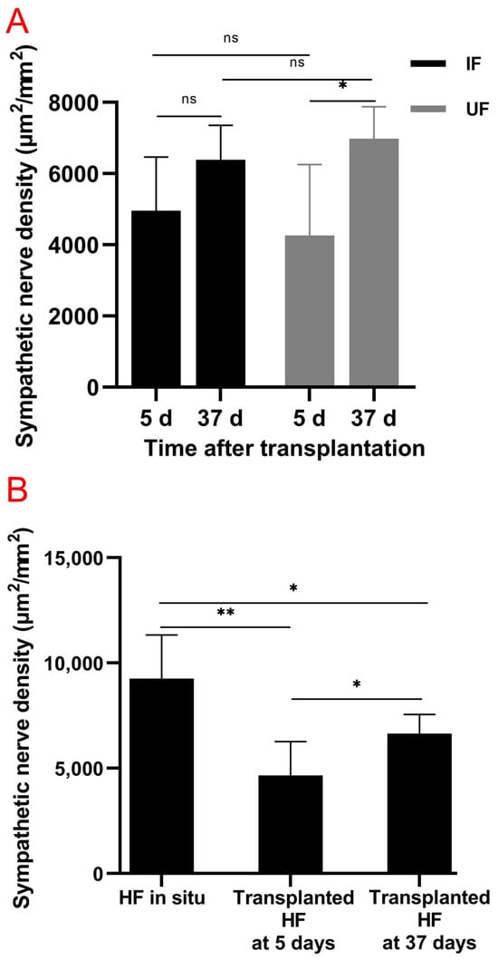 Partial restoration of sympathetic reinnervation around the transplanted follicles. (A) Change in sympathetic nerve density around the xenografted follicles in the IF and UF groups after 5 days and 37 days (two-way ANOVA, Bonferroni’s post test). (B) Change in sympathetic nerve density around normal vibrissa follicles in situ and xenografted follicles after 5 days and 37 days. Comparisons between xenografted follicles at 5 days and 37 days were conducted by a two-way ANOVA, while comparisons between normal vibrissa follicles in situ and xenografted follicles after 5 days or 37 days were performed using a one-way ANOVA. n = 3–10 mice for each condition. Bars represent means ± standard deviation. * p < 0.05; ** p < 0.01; ns, not significant.