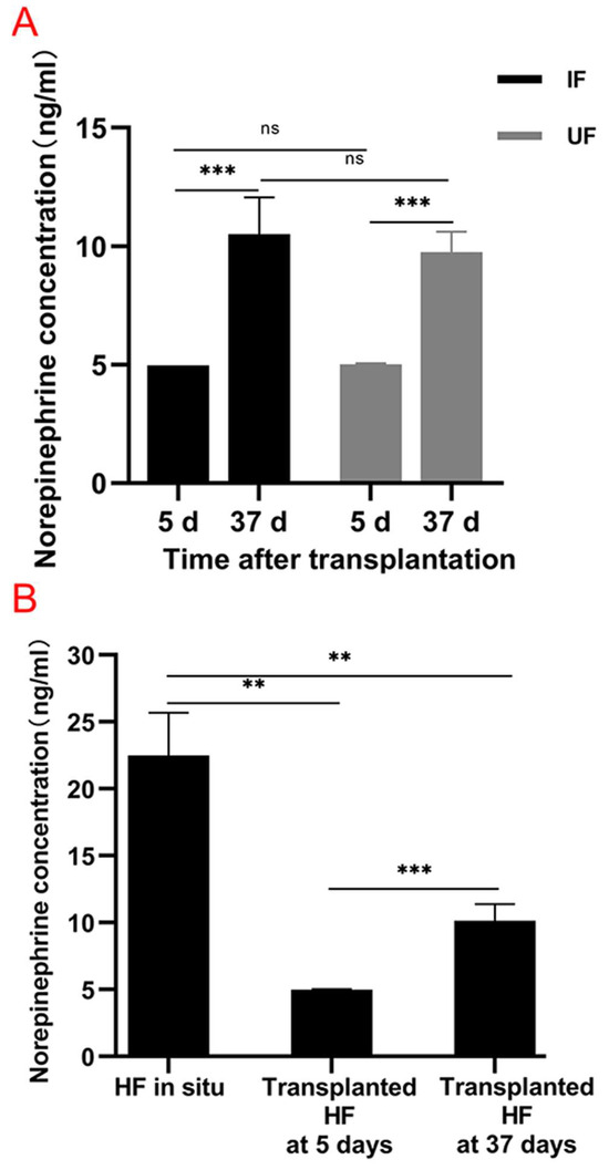 To investigate the changes in norepinephrine concentrations of normal follicles in situ and xenografted follicles after 5 days and 37 days, an ELISA was performed. Figure 6A shows that in the IF and UF groups, norepinephrine concentrations after 37 days were significantly elevated compared with those after 5 days (2.11-fold, p = 0.000; 1.94-fold, p = 0.000, respectively). Figure 6B shows that the norepinephrine concentration of normal follicles in situ was significantly higher than those after 5 days and 37 days (4.04-fold, p = 0.002; 2.04-fold, p = 0.002, respectively). A higher norepinephrine concentration was observed in the xenografted follicles on Day 37 compared with that on Day 5 (2.03-fold, p = 0.000).