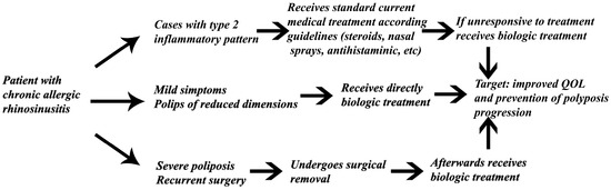 Currently, the guidelines for managing allergic chronic rhinosinusitis focus on symptomatic treatment and eventually surgical solutions like turbinate reduction with radiofrequency, coblation or endoscopic sinonasal surgery [78]. However, surgical management should be reserved for cases in which symptoms cannot be controlled [79]. Further evolution of the allergic chronic rhinosinusitis led to mucosal degeneration and the development of polyposis [80]. This raises the question of when biological treatment should be initiated. There are still debates whether biologic treatment could be initiated before surgical removal or after surgical removal of the polyps [81]. The main trend is focusing the research on preventing recurrence after surgical removal [82]. Among the factors responsible for recurrence after endoscopic sinus surgery are high levels of eosinophil cationic protein, high anti-double-stranded DNA IgG, high IL-5, high modified Lund–Mackay radiographic score and asthma [83]. There is still the question regarding the dimensions of the polyps and the level of polyposis that is still responding to the action of biological treatments [84]. The ultimate goal is the increase in the quality of life of the patient with chronic allergic rhinosinusitis [85]. EPOS2020 (The European Position Paper on Rhinosinusitis and Nasal Polyps—a long-standing initiative of the European Rhinologic Society in creating guidance for the management of patients with CRS) advised on the use of biologics in the treatment of CRSwNP. This update was written in collaboration with the European Forum for Research and Education in Allergy and Airway Diseases (EUFOREA), an international not-for-profit organization with the aim of preventing and improving the burden of chronic respiratory diseases. The authors considered that patients who have the proof of presence of bilateral polyps and have ESS in their medical history if they present evidence of type 2 inflammation, the need for systemic corticosteroids or contraindication of systemic steroids, significantly impaired quality of life, significant loss of smell and diagnosis of comorbid asthma, are suitable candidates for biologics. Five criteria were suggested to be evaluated for defining response: reduced nasal polyp size, a reduced need for systemic corticosteroids, improved quality of life and sense of smell and reduced impact of comorbidities at 16 and 48 weeks [86]. We believe that a personalized approach should be applied in any cases with initial symptomatic and surgical treatment, followed by administering biologic treatment for prevention of recurrence, Figure 2.