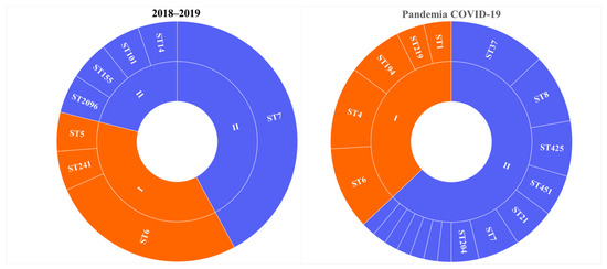 Genetic diversity of L. monocytogenes isolated from patients with invasive listeriosis (A) before and (B) during the COVID-19 pandemic. I - phylogenetic lineage I, II - phylogenetic lineage II.