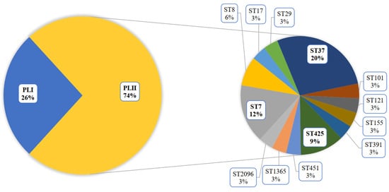 The COVID-19 pandemic revealed a large diversity of L. monocytogenes of the PLII in clinical cases (Figure 1) [18]. L. monocytogenes ST37 that appeared during the pandemic took first place and shared 13% among all clinical isolates (Figure 1) and 21% among isolates of the PLII.