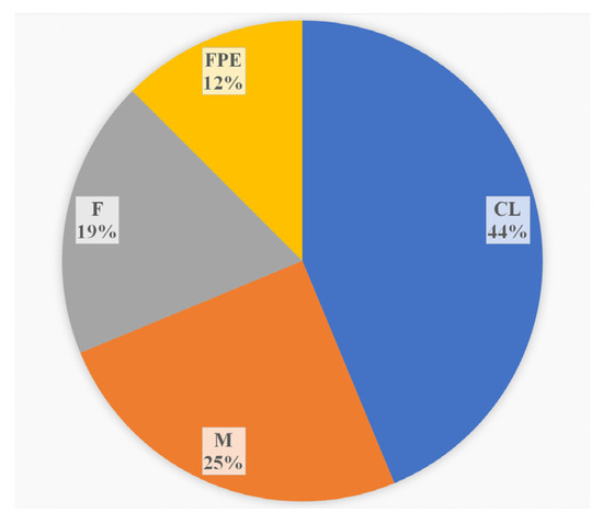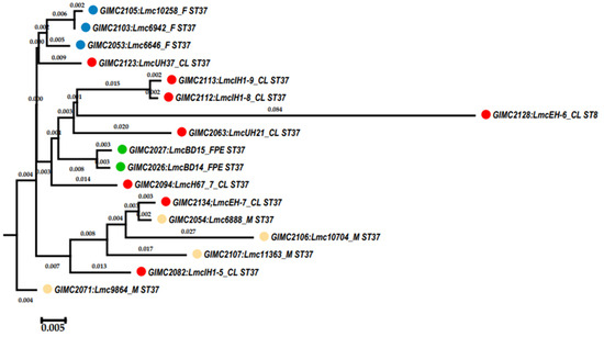 The sources of L. monocytogenes ST37 in the study. CL—clinical specimens, M—meat products, F—fish products, and FPE—restaurant cooking environments.