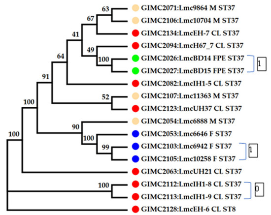 The greatest contribution to the diversity of the PLII genotypes was made by patients with meningitis and septicemia. A total of 72% of patients in this cohort were male. All cases of L. monocytogenes ST37 were noted in this group. The male patients were mostly infected with L. monocytogenes of the PLII (Figure 2), and ST37 shared 20% in this group.