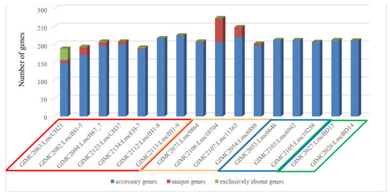The central phylogenetic group included the most different clinical isolates, the pair of the FPE isolates, and two other clinical isolates—one of which is LmcUH21 and has the smallest number of ORFs (open reading frames, 2840) and homologous genes (72) but also the largest number of exclusively absent genes (38) (Figure 6).