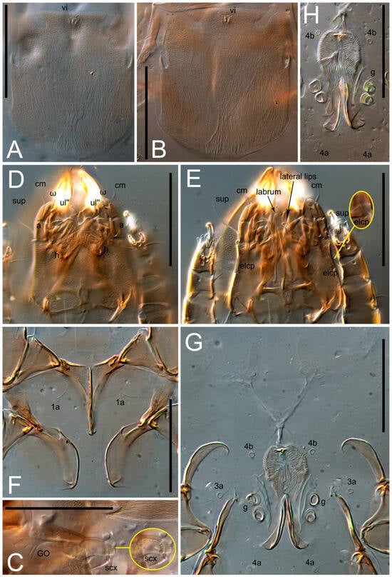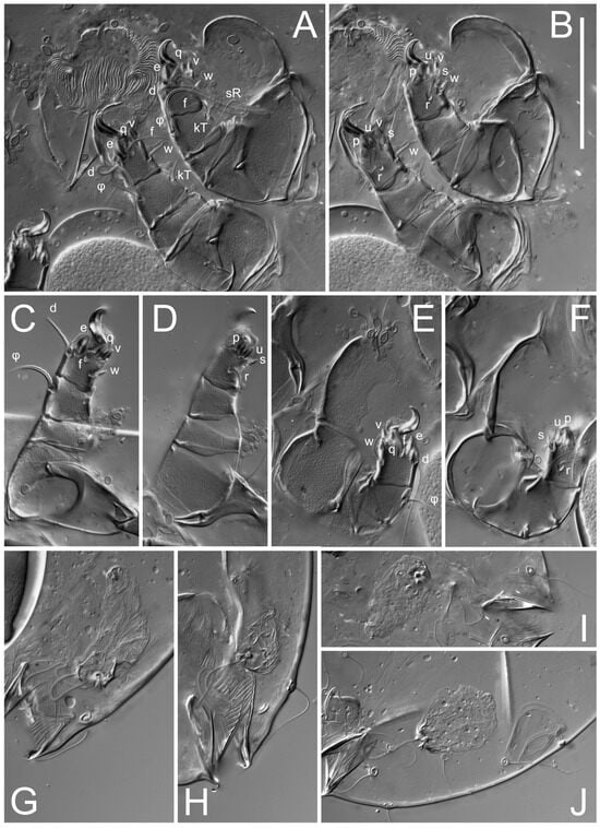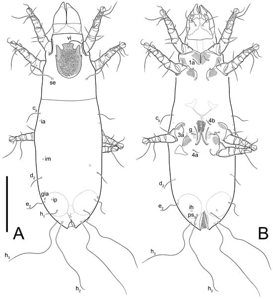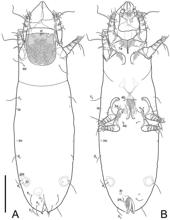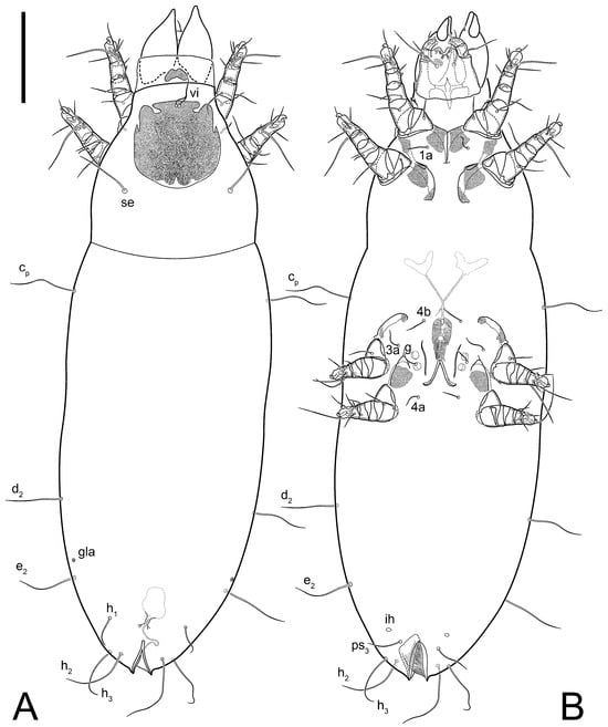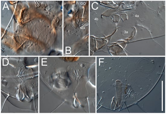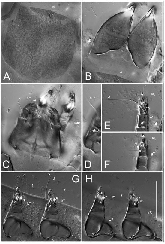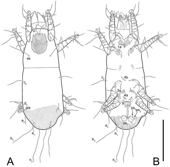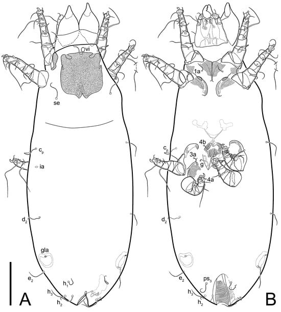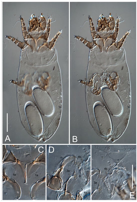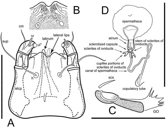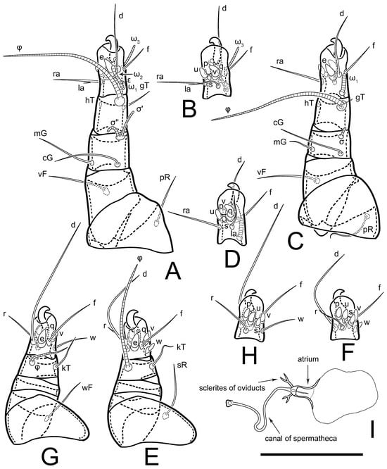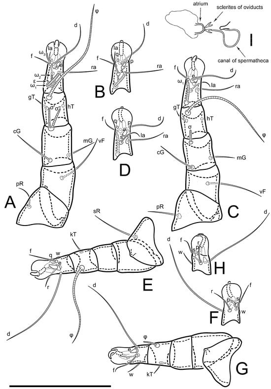 Figure 5E,F. Ovipore situated between coxal fields III and IV; genital valves of ovipore shaped as an inverted Y; epigynal and medial apodemes well-developed. Genital papillae medium-sized, their diameters approximately 5–6-times shorter than the length of genital setae. Anal opening on posterior margin of idiosoma, mostly ventral, with substantial portion situated terminally and dorsally. Copulatory tube weakly developed. Canal of spermatheca long, slender, and uniform in diameter (not widened at entrance to spermatheca), forming a small, well-sclerotized, cup-shaped atrium. Spermatheca simple, with small sclerotized base and small, paired, Y-shaped sclerites of oviducts.