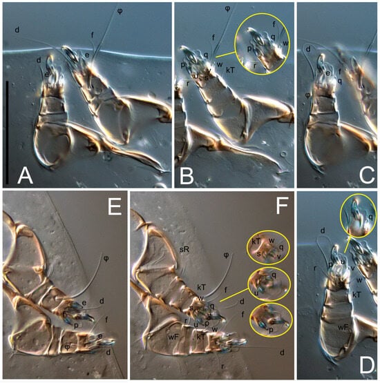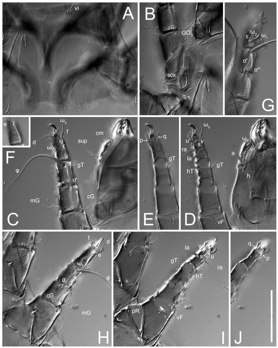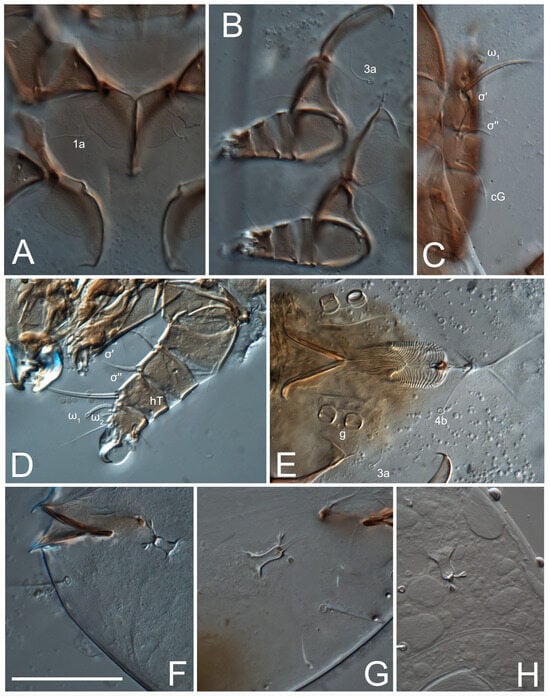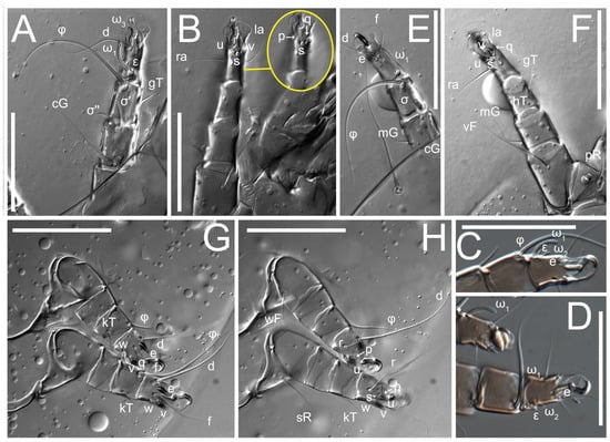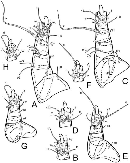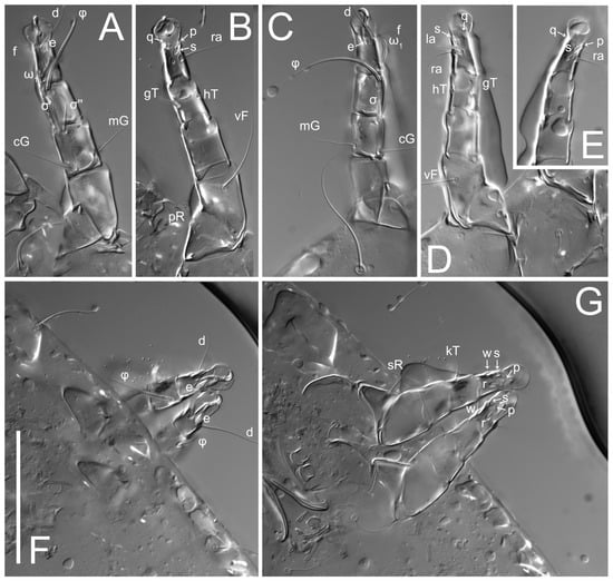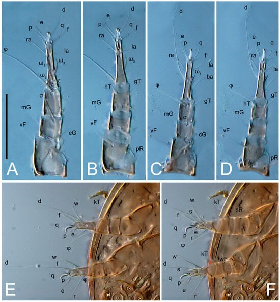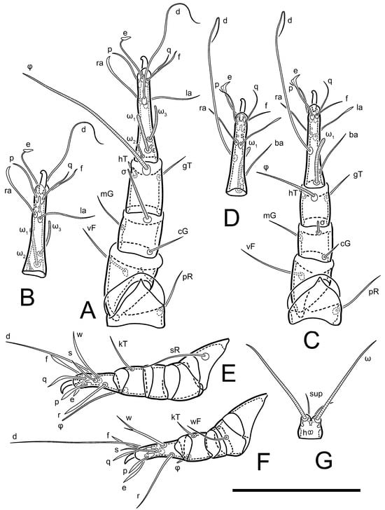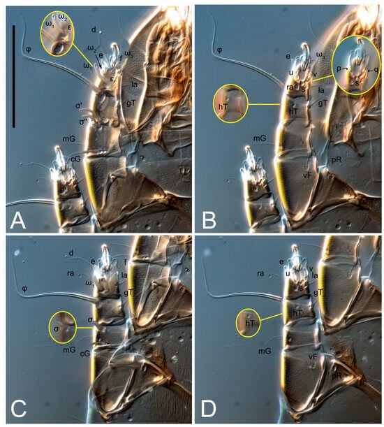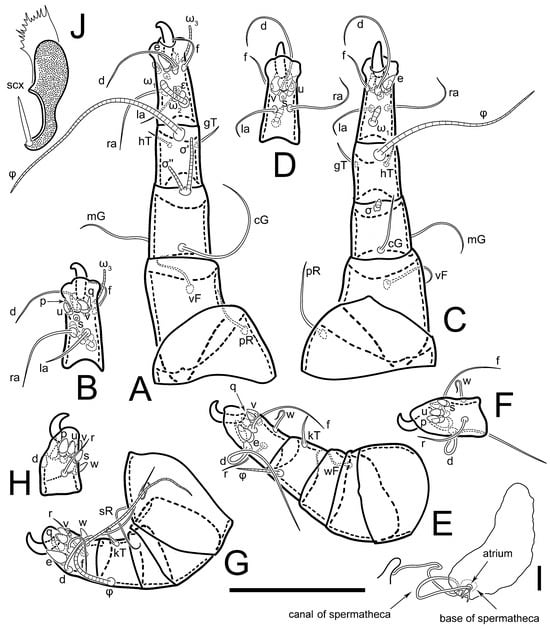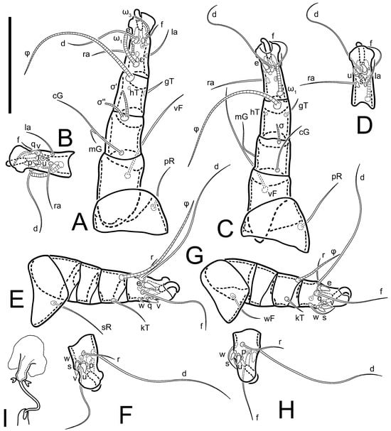 2. Famulus (ε) of tarsus I wide, spiniform, with broadly rounded apex, widest at middle. Solenidia φ of tibiae I–III elongate, tapering, well-extended beyond apices of respective tarsi with ambulacra; solenidion φ IV shorter, shorter than tarsus IV (with ambulacra). On genu I, solenidion σ’ elongate, tapering, slightly not reaching bases of φ I, about 1.8-times longer than σ’’; σ’’ I slightly wider than σ’, about half the length of tibia I. On genu II, solenidion σ very short and somewhat conical. Solenidion σ of genu III absent.