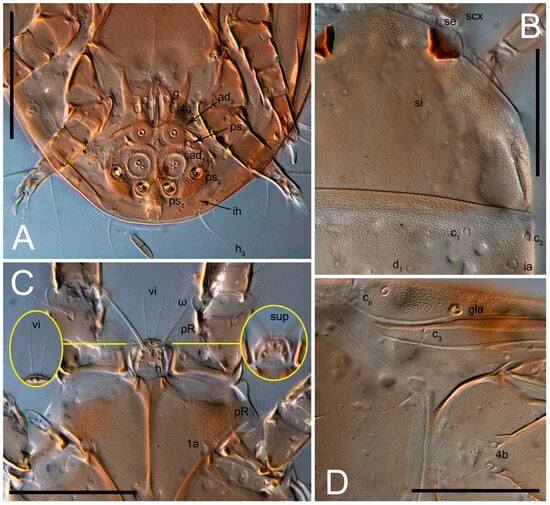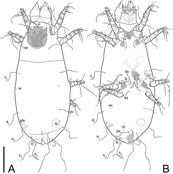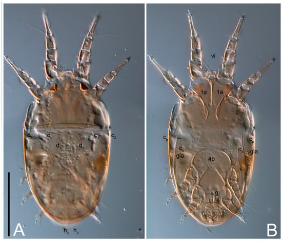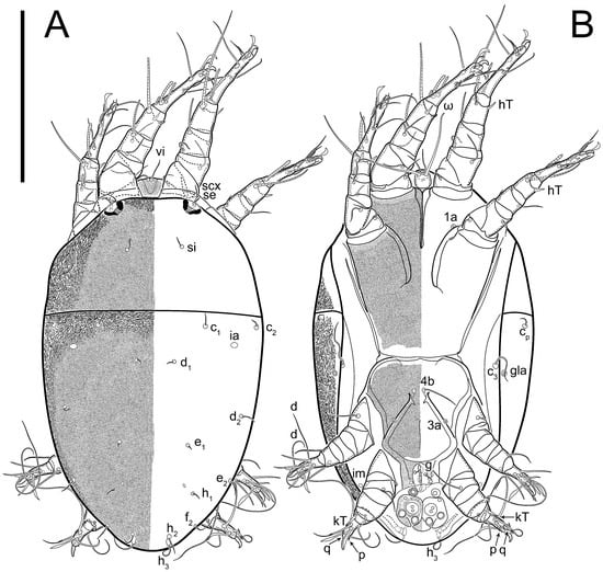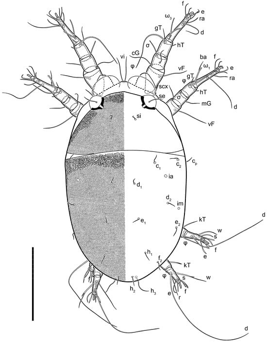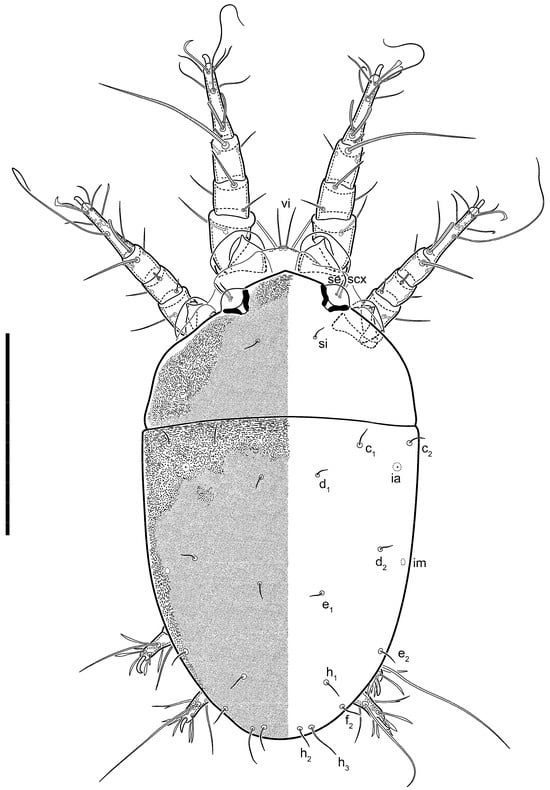 Dorsum. Propodosoma and hysterosoma each covered by smoothly punctate shields; distinct linear pattern present on anterior and lateral sides of propodosomal sclerite and hysterosomal shield. Anterior propodosoma with internal vertical setae (vi) (bases separated) and a single sclerite. A pair of lateral ocelli present on propodosoma, widely separated from each other (distance 35–42, n = 4); lenses and pigmented spots present; maximal diameter of lenses 12–14, n = 4. External vertical setae (ve) absent; external scapular setae se situated just below eye lenses; internal scapular setae (si) distinctly posterior and medial to external scapulars (se). Supracoxal setae of legs I (scx) filiform, with extended base, satiated below se. Sejugal furrow well-developed. Propodosomal sclerite 65–80, n = 4, hysterosomal shield 139–160, n = 4, ratio hysterosomal shield/propodosomal sclerite = 2.0–2.13. Hysterosomal shield with 11 pairs of simple, filiform setae (c1, c2, cp, d1, d2, e1, e2, f2, h1, h2, h3), setae h3 distinctly longer than others. Opisthonotal gland openings (gla) ventral, situated on hysterosomal shield, slightly posterior to setae c3. Of four fundamental pairs of cupules, three pairs observed: ia posteriomediad of setae c2, im ventral, lateral to trochanter IV, ih ventral, lateral to posterior portion of attachment organ.