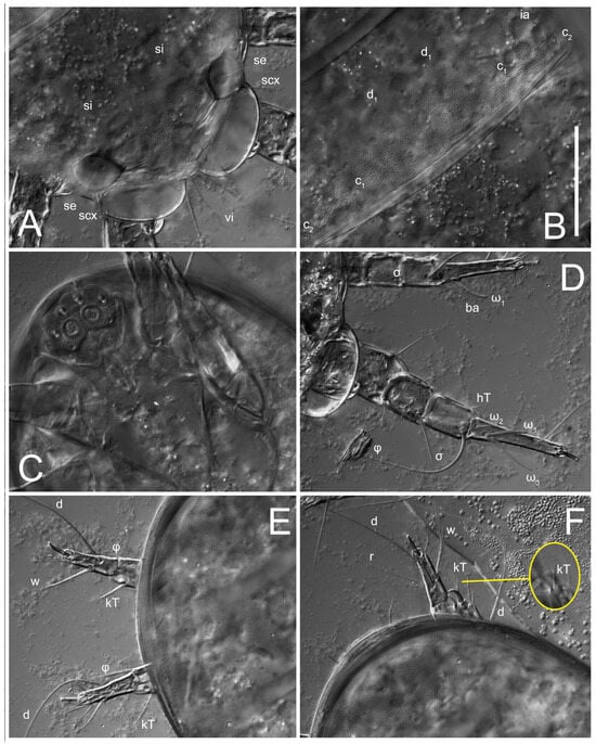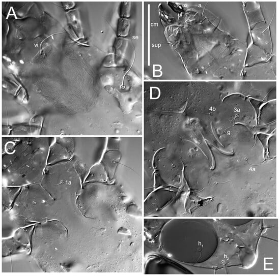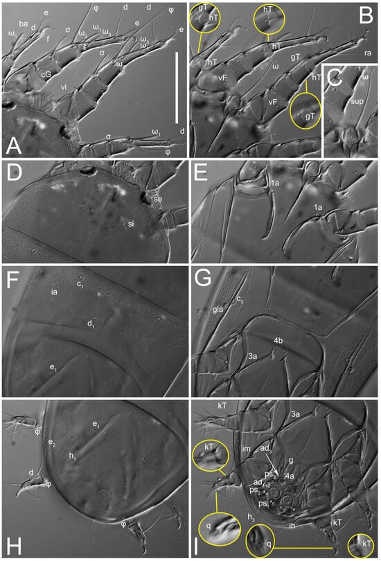 Grandjean’s organ (GO) expanded into 13 membranous finger-like extensions. Supracoxal seta (scx) smooth, sword-shaped, widened, and flattened, tapering at tip. Idiosomal setae (vi, se, cp, d2, e2, h1, h2, h3, ps3) smooth, filiform, and short; opisthosomal gland openings slightly anteriad of setal bases e2. One pair of fundamental cupules (ia) present (other cupules not observed).