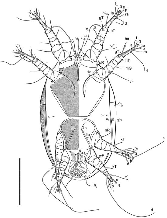 - Setae h2 and h3 long, their lengths are 1.8-times longer than the length of the prodorsal shield; spines p and q shorter than spines u and v on tarsi III–IV. USA (Michigan), Canada (Ontario). …………………………………………………………………………………………………………………………………………………………………………………Th. ojibwe sp. n.