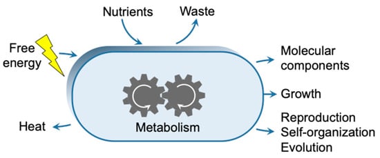 There is no obvious connection between the evolutionary description of biology and the thermodynamic requirements for the self-organization of living organisms. The proposal by Schrödinger [21] that living organisms continually draw “negative entropy” from their environment was highly provocative since it is obviously in contradiction with Boltzmann’s definition of entropy that is incompatible with negative values. However, feeding a system with low-entropy energy and coupling dissipation with its self-organization [2], constitutes an alternative means that avoids any violation of physical laws. This statement expresses the view that the self-organization features associated with life cannot be settled without introducing a functional coupling of growth and evolution with energy dissipation. This coupling should be considered as one of, if not the main role of the metabolism, from an evolutionary perspective (Figure 1). Therefore, the synthesis of molecular components of the cell, which would actually not necessarily be incompatible with a close to equilibrium situation, does not constitute the only function of metabolism, consistently with earlier thoughtful remarks on the fact that the focus of origin of life research should not only consider anabolism [26]. Its additional evolutionary role has independently ensured the maintenance of a non-equilibrium state from the time that life on Earth emerged some 3.5 billion years ago, and, therefore, would have been present as a component of a “minimal metabolism” [27]. The energized character of living entities associated with the irreversibility of dissipation is then intimately responsible for their maintenance and evolutionary features, a connection that needs to be directly addressed.
