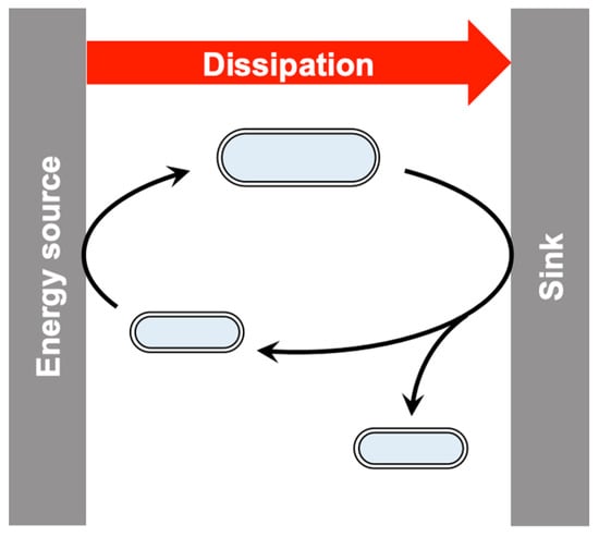 Dissipation takes place when a gradient of energy is present in the environment between a source of high potential (corresponding to low-entropy energy) and a sink corresponding to a degraded form of energy (high-entropy) from which work can no longer be obtained (Figure 2). However, without kinetic barriers the potential of the source would become spontaneously exhausted, rapidly leading to the equilibrium state, without the possibility of alternative pathways. Therefore, such barriers need to be present in order that disequilibrium can be held for significant periods of time [28,29,30,31]. The process through which living cells can multiply without violation of the Second Law in this context is depicted in Figure 2. Indeed, reproduction and dissipation proceed at the same time, being part of a single process, the cell cycle, which must necessarily be consistent with physical principles. This process induces both energy dissipation as well as the realization of chemical work through the formation of an extra cell which itself corresponds to a non-equilibrium entity. It is important, at this stage, to emphasize that living entities must correspond to energized systems and that their existence within an equilibrium environment would lead to their fast decay to the equilibrium state and death. This non-equilibrium requirement can also be understood by considering that any evolutionary process needs single entities to be eliminated (biologically speaking, to die) in order that they can be replaced by improved ones [24]. Therefore, three different elements, namely the metabolic features of life requiring the maintenance of an energized non-equilibrium situation, an evolutionary capability, and a dissipative process, turn out to be intimately linked to each other in constituting a living entity. All depend on the continual presence of disequilibrium of the system with respect to the environment.