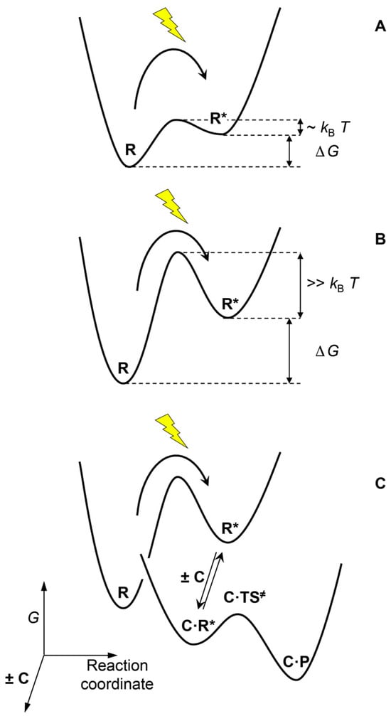 Activating a chemical system can lead to different situations depending on the free energy difference ΔG between the activated state R* (in this work, the asterisk indicates that the molecular entity is not thermodynamically stable and therefore absent at equilibrium) and the inactivated reactant R and on the kinetic barrier separating the two states. (A) It may lead to an unstable state with no significant lifetime, or (B) to a kinetically stable state depending on the height of the barrier separating the activated state from the equilibrium state. (C) The existence of kinetic barriers opens the possibility of alternative pathways depending on the presence of additional reactants, as for instance a catalyst C forming a complex C·R* with the activated state R* thereby stabilizing the transition state TS≠ leading to product.