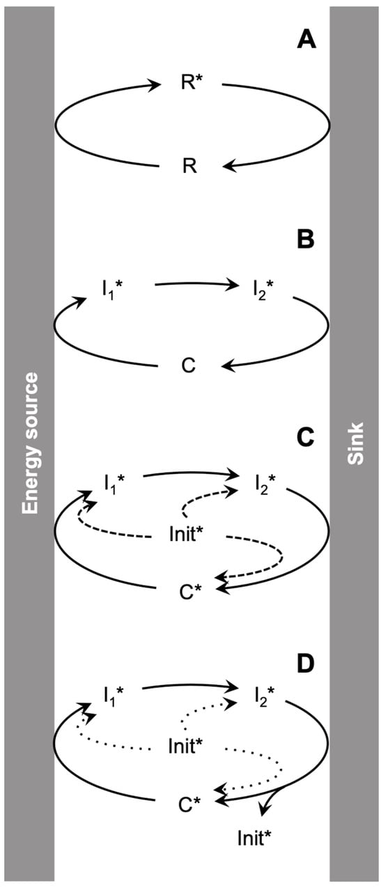 Indeed, establishing a correspondence between the description of cycles in terms of free energy (including that of transition states) and their kinetic properties is not straightforward. It could turn out to be essential to account in a quantitative way for self-organization in these systems. It has been the topic of investigations in the field of catalysis [58]. Methods that are beyond the scope of the present investigation have also been proposed to represent systems prone to self-organization processes, such as molecular motors or self-assembly processes [59]. However, relevant information can be obtained through a much simpler investigation into the means by which activated reaction cycles can also operate when arising through the effect of an energy gradient. Cyclic arrangements of increasing complexity are depicted in Figure 4, starting from a simple activation cycle in which a reactant R is brought to an activated state R* by interaction with an energy source and then deactivated through a spontaneous pathway, releasing heat into the environment (Figure 4A). Regarding the environment in which the energy source is held in a disequilibrium state by kinetic barriers [28,29,30,31], this process can be considered as catalytic by increasing the flux transferred into the sink. It may involve a non-limited number of intermediates like I1* or I2* constituting a catalytic cycle (Figure 4B). In these catalytic cycles, activated intermediates R*, I1* or I2*, thermodynamically unstable by definition, are maintained in a steady state corresponding to a state of Dynamic Kinetic Stability (DKS), and their concentration is determined by kinetics. If the disequilibrium is suspended by removing the energy source, the system will evolve towards thermodynamically stable reactant R or catalyst C. The whole cyclic process would be recovered from those species after re-establishing the non-equilibrium environment.
