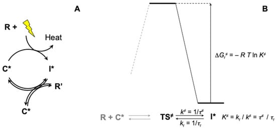 The potential that needs to be dissipated in order that the system becomes irreversible is assessed by considering a hypothetical reproduction cycle corresponding to the definition of an EAS in which the irreversible process (dissipation) is separated from the equilibrium synthesis of two copies of the catalyst C*. (A) Dissipation takes place during the formation of an intermediate I* from a catalyst C*. The intermediate I* carries the chemical potential needed for the formation of two copies of the unstable catalytic entity C*. R and R’ constitute non-activated reactants. (B) Irreversibility can be accounted for by uniquely considering the transformation from the intermediate I* back to the transition state TS≠, which must be slower than the rate at which the whole cycle proceeds in the forward direction. It is independent of the values of free energy (omitted) characterizing states preceding the transition state TS≠, as the reactant state (R + C*, depicted in grey), which have been intentionally ignored to make this point unambiguous. The kinetic barrier ΔGr≠ is related to the ratio of the forward and reverse reaction rates (K≠ = kr/k≠) and therefore to that of the times needed for these processes to take place, namely τ≠ the lifetime of the transition state (defined as τ≠ = 1/k≠) and τr the timescale of the backward process (defined as τr = 1/kr).