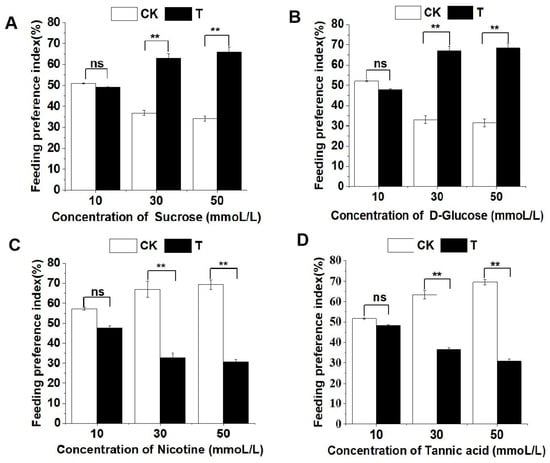 - Wang, Y. Effects of Sucrose and Sinigrin on Feeding Preferences and Gustatory Perceptions of Caterpillars in Two Helicoverpa Species. Master’s Thesis, Henan Agricultural University, Zhengzhou, China, 2018. [Google Scholar]