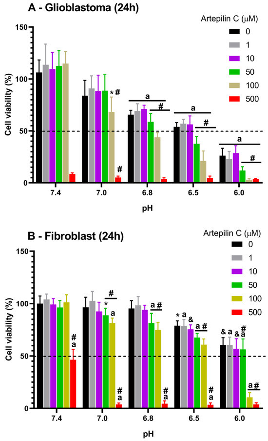 MTT-based cell viability assay of glioblastoma (A) and fibroblast (B) cells at different pH values after 24 h incubation with 0, 1, 10, 50, 100, and 500 µM of Artepillin C. * for p < 0.05, & for p < 0.01, a for p < 0.001 compared to the general control (0 µM Artepillin C, pH 7.4); # denotes significant difference between the groups and their specific pH control (0 mol/L Artepillin C, respective pH value).